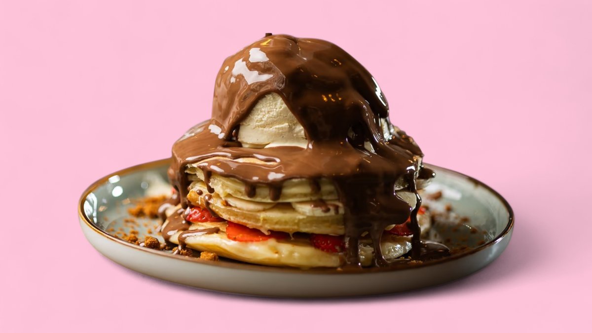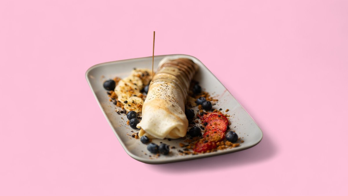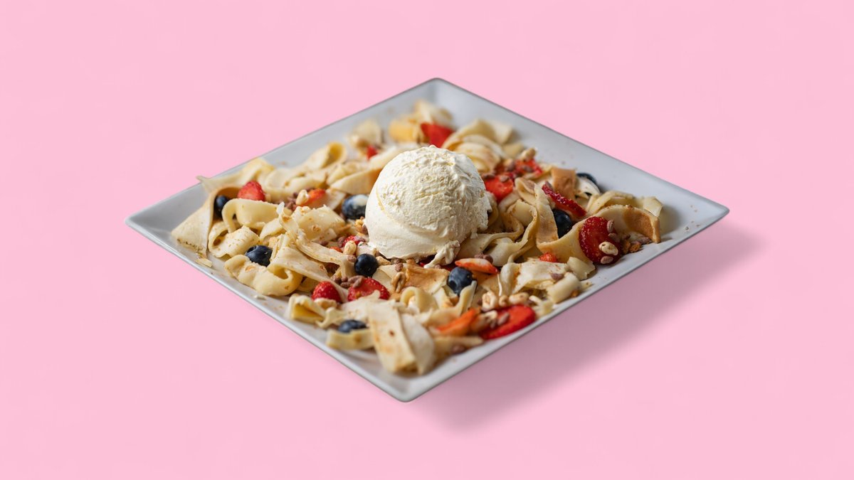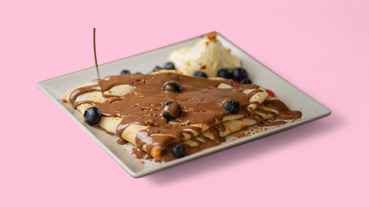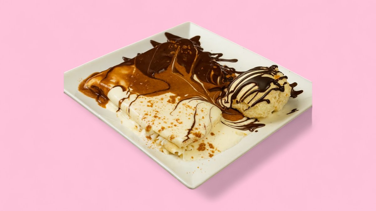 Crepe-Streifen mit Eis, Schokolade und einer Zutat deiner Wahl Das Gericht wurde mit Schokolade zubereitet und kann Spuren von verschiedenen Nüssen enthalten