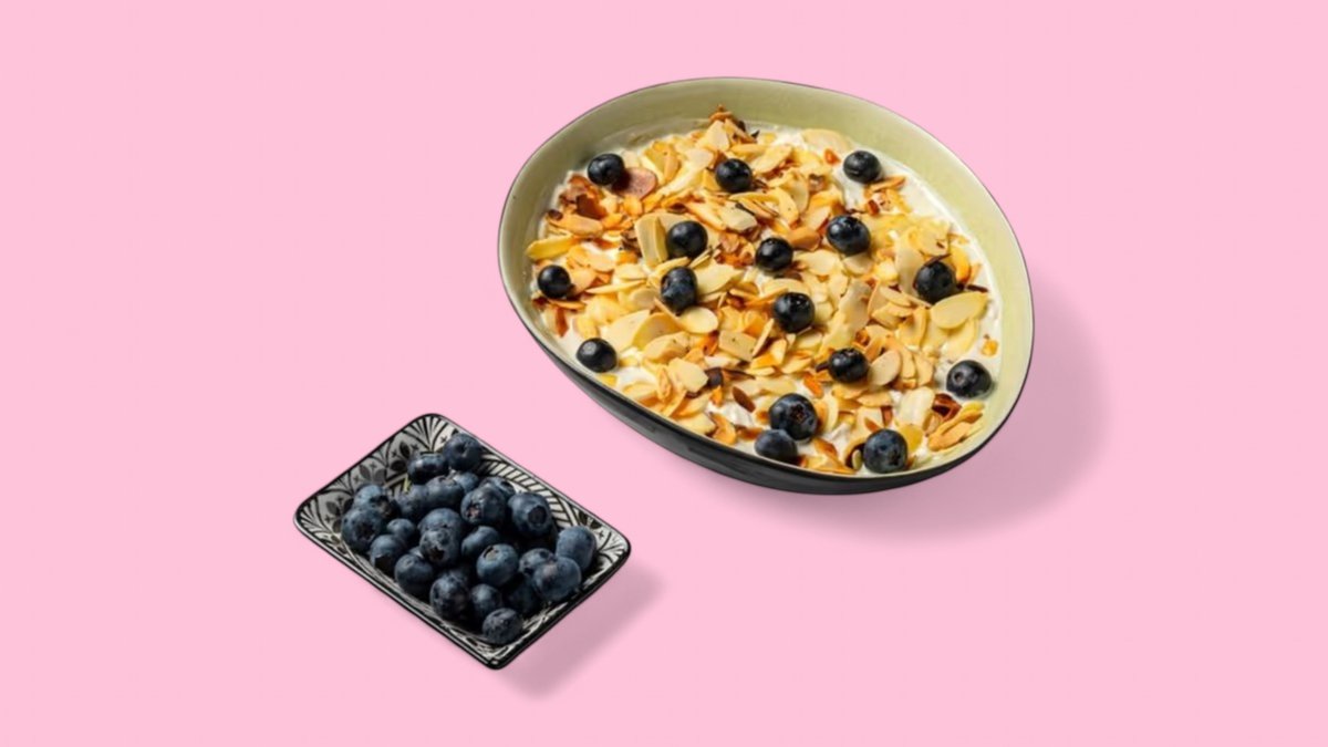 vitaminreich und ballaststoffreich Haferflocken mit griechischem Joghurt, Apfelsaft, Mandeln und frischen Blaubeeren