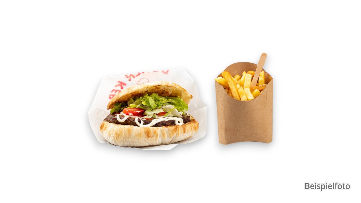 1 x Lahmacun mit Dönerfleisch 1 x Portion Pommes frites mit einer Soße deiner Wahl 1x alkoholfreies Getränk 0,33 l deiner Wahl