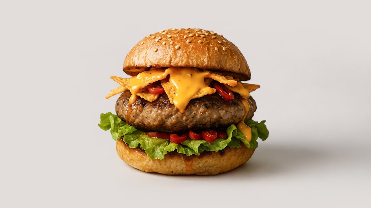 scharf mit Steak-Pfeffer-Brötchen, Cheddar, knusprigen Nachos, feuriger Cheddarsoße, rauchiger Barbecuesoße, roten Jalapeños und Salat