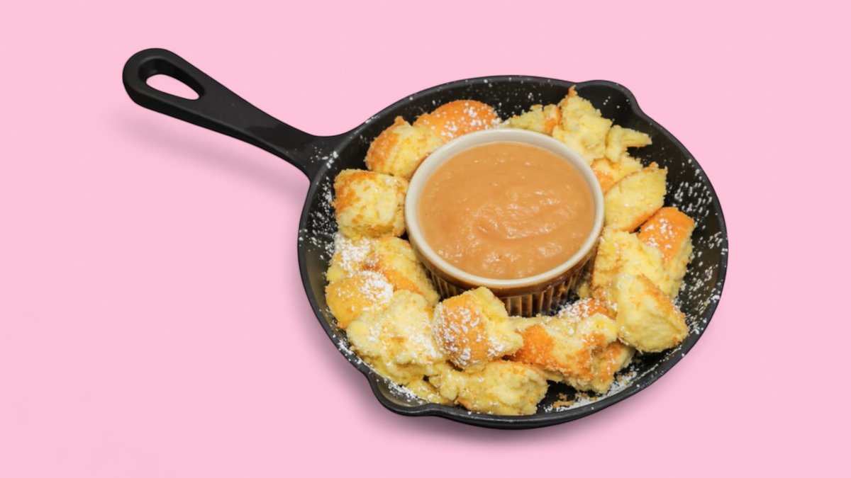 Das Gericht wurde mit Schokolade zubereitet und kann Spuren von (verschiedenen) Nüssen enthalten Käsekuchen mit karamellisierter Kruste und Schokosoße