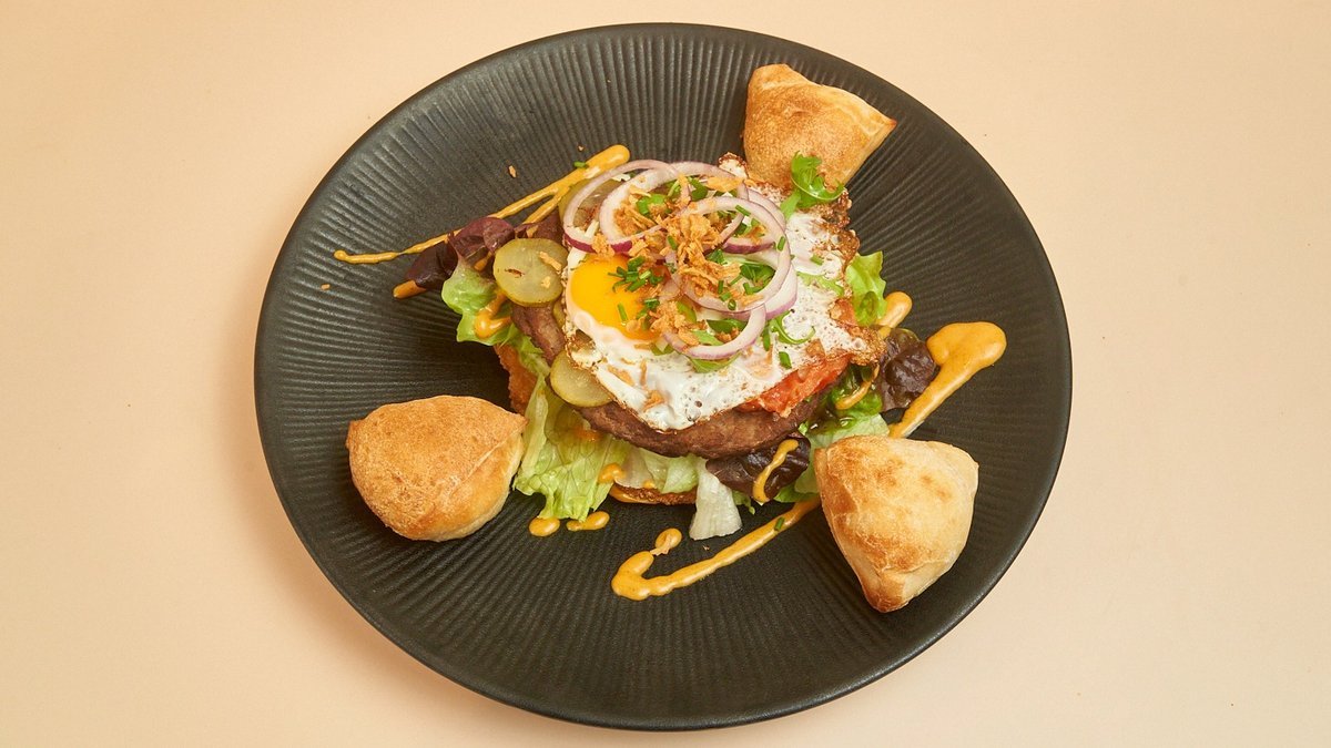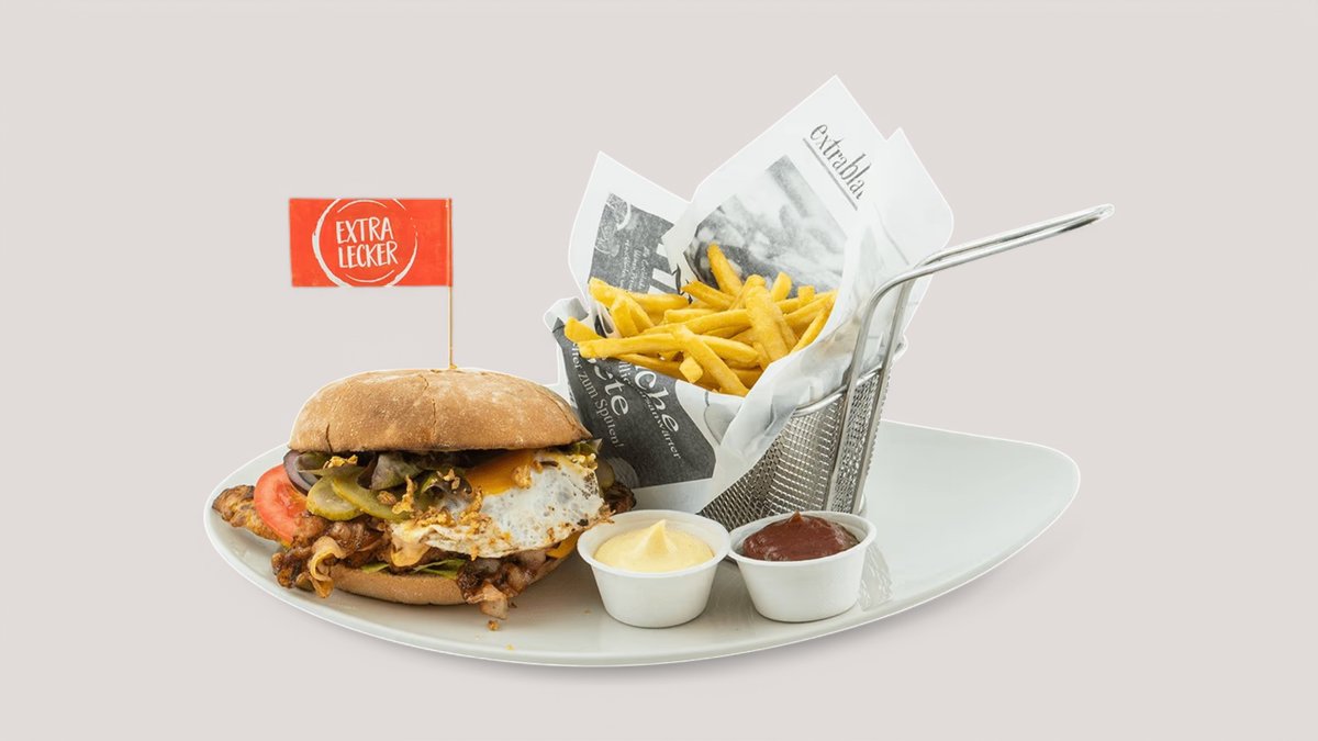 180 g Rinderhackfleisch mit hausgemachter Burgersoße, Essiggurken, Tomaten, roten Zwiebeln, Röstzwiebeln, Spiegelei und Cocktailsoße und 3 frisch gebackenen Pizzabrötchen