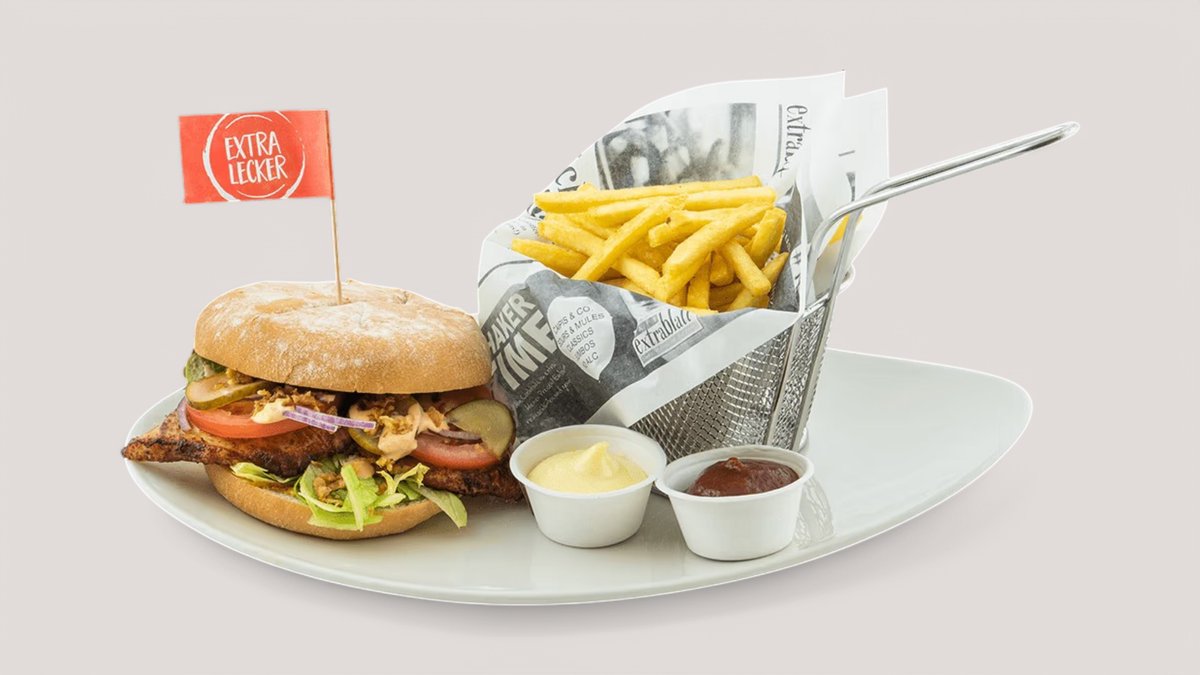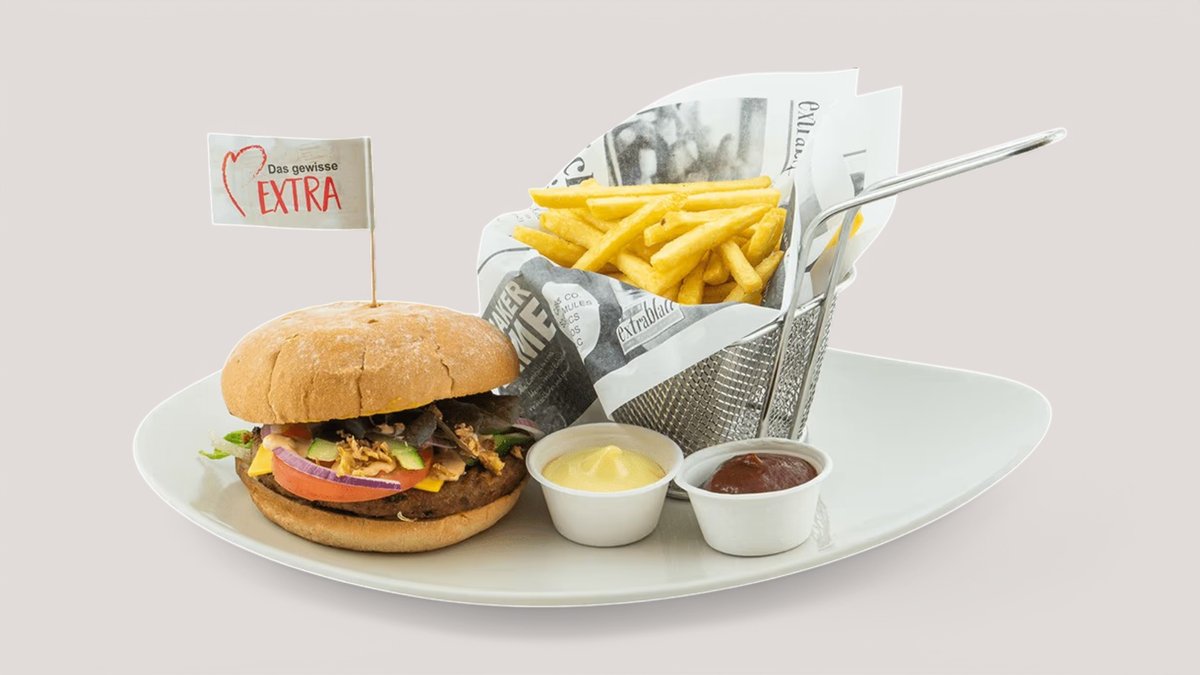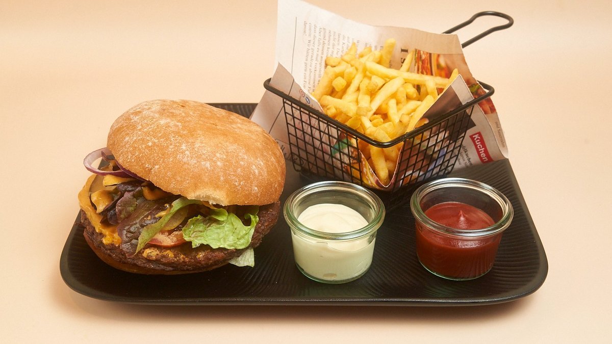 alle Burger werden mit Eisberg-Eichblatt und einem Brötchen deiner Wahl zubereitet und mit Ketchup, Mayonnaise und einer Beilage deiner Wahl serviert („Breadless Kartoffelburger” wird ohne Beilage, Mayonnaise und Ketchup serviert)