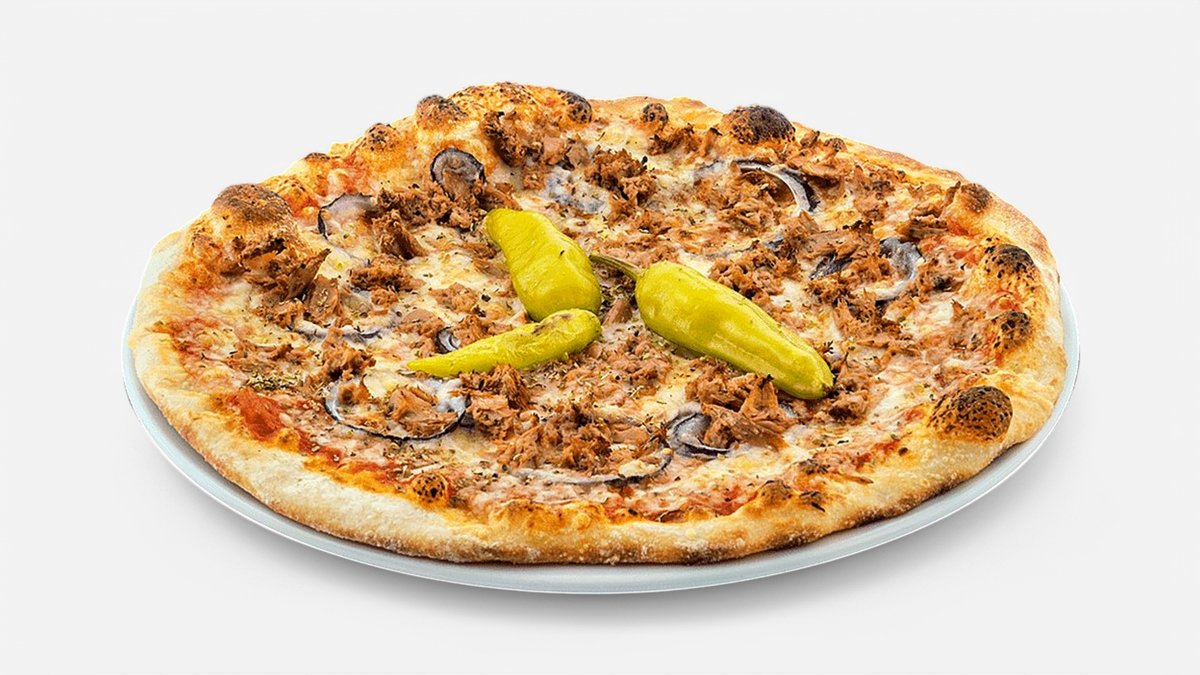 mit Tomatensoße, Käse, Thunfisch, roten Zwiebeln und milder Peperoni