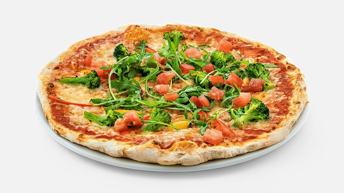 mit Tomatensoße, Käse, marinierten Tomatenwürfeln, Paprika, Brokkoli und Rucola
