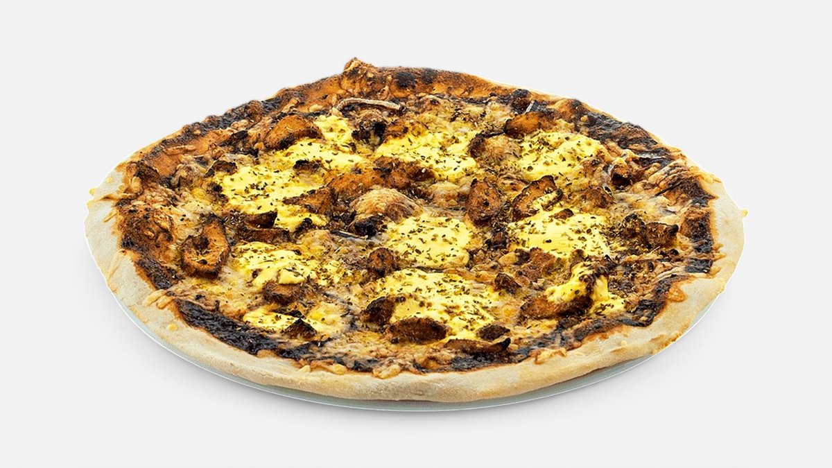 mit Barbecuesoße, Käse, Hähnchen-Fajita-Fleisch, Sauce hollandaise und roten Zwiebeln
