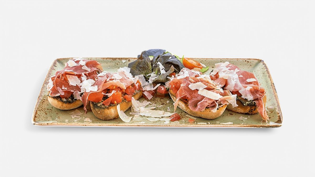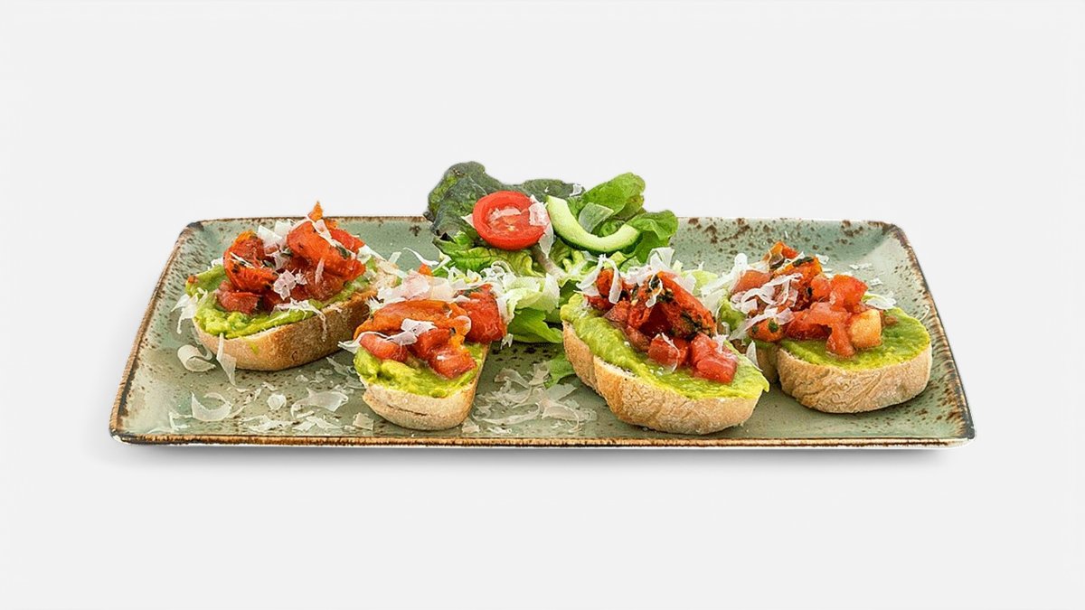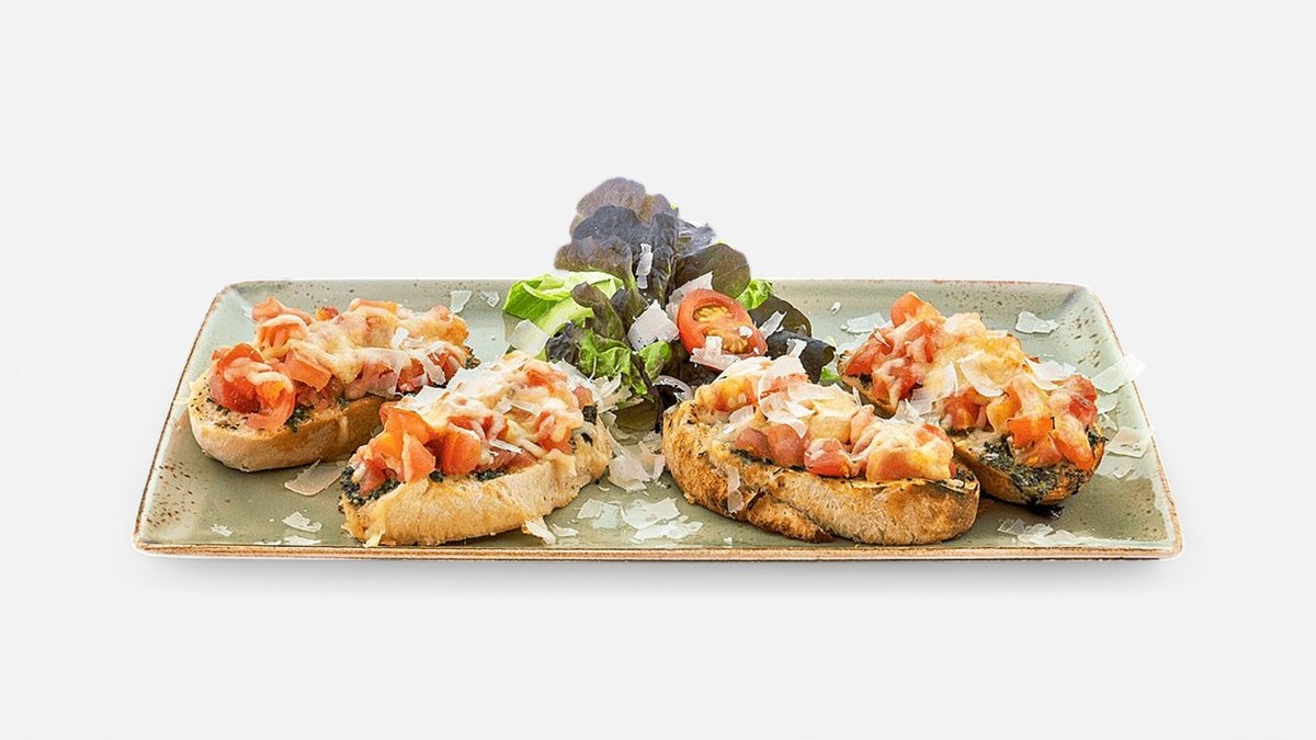 alle Gerichte werden mit Pesto, marinierten Tomatenwürfeln und Parmesan zubereitet („Bruschetta Avocado” wird ohne Pesto und marinierten Tomatenwürfeln zubereitet)