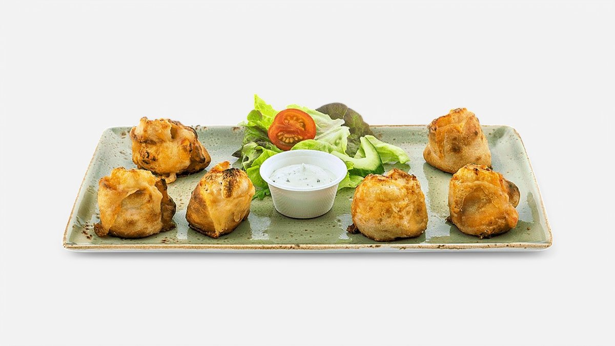 mit Rucola, 1 knusprig gebackenem Hähnchenbruststreifen, 3 Tintenfischringen, 2 Mozzarella-Sticks, 3 frisch gebackenen Pizzabrötchen und Sauerrahm-Dip