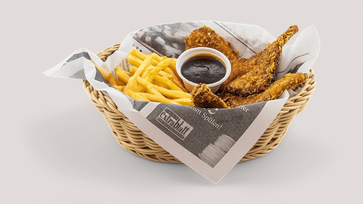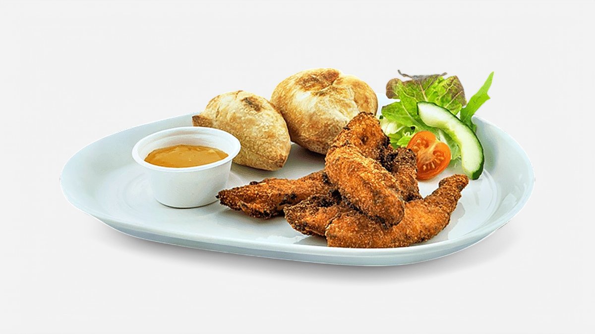 mit knusprig gebackenen Hähnchenbruststreifen und einem Dip deiner Wahl