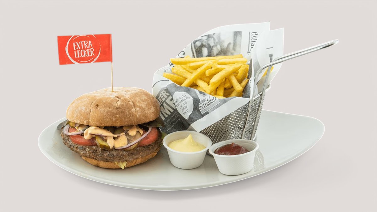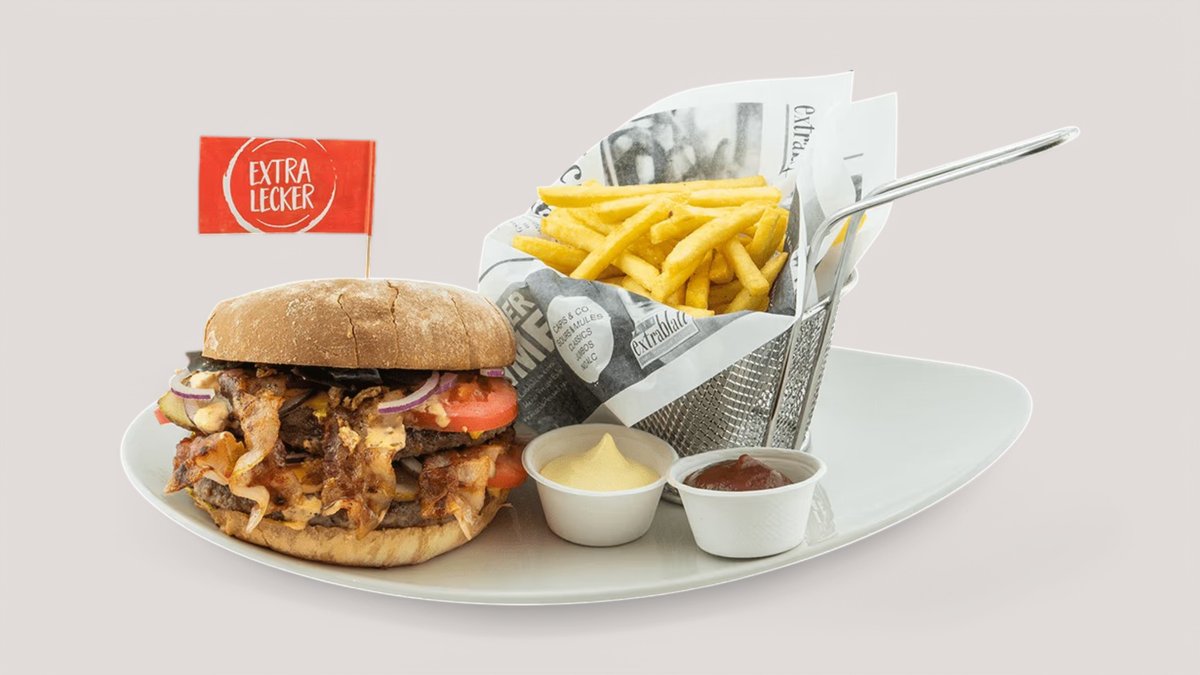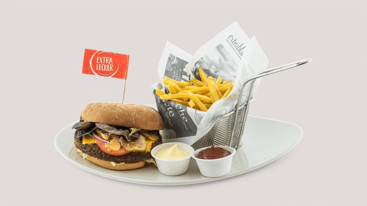 180 g saftig gebratenes Rinderhackfleisch mit hausgemachter Burgersoße, Chesterkäse, knusprigem Schweinespeck, Gewürzgurken, Tomaten, roten Zwiebeln, Röstzwiebeln und Cocktailsoße