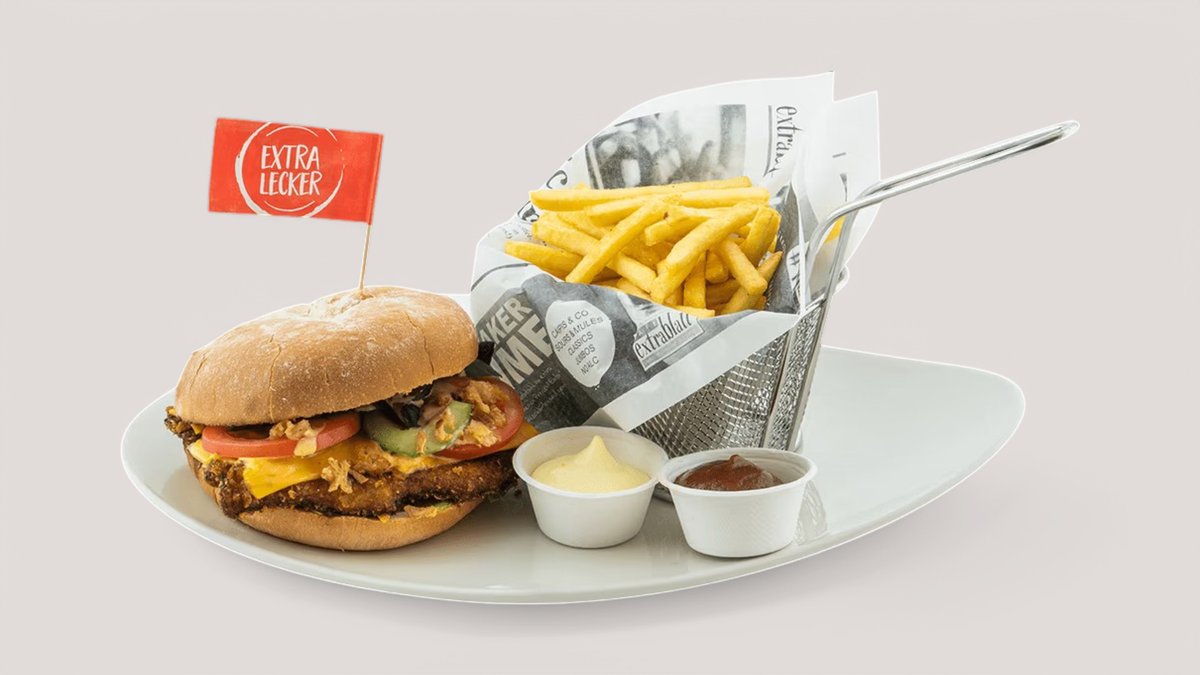 gebratene Hähnchenbrust mit hausgemachter Burgersoße, Chesterkäse, Essiggurken, Tomaten, roten Zwiebeln, Röstzwiebeln, knusprigem Schweinespeck, Spiegelei und Cocktailsoße