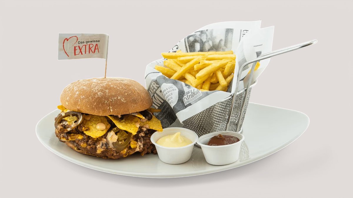 scharf 180 g saftig gebratenes Rinderhackfleisch mit hausgemachter Burgersoße, Chesterkäse, Chili con Carne, Jalapeños, Nachos und Cocktailsoße