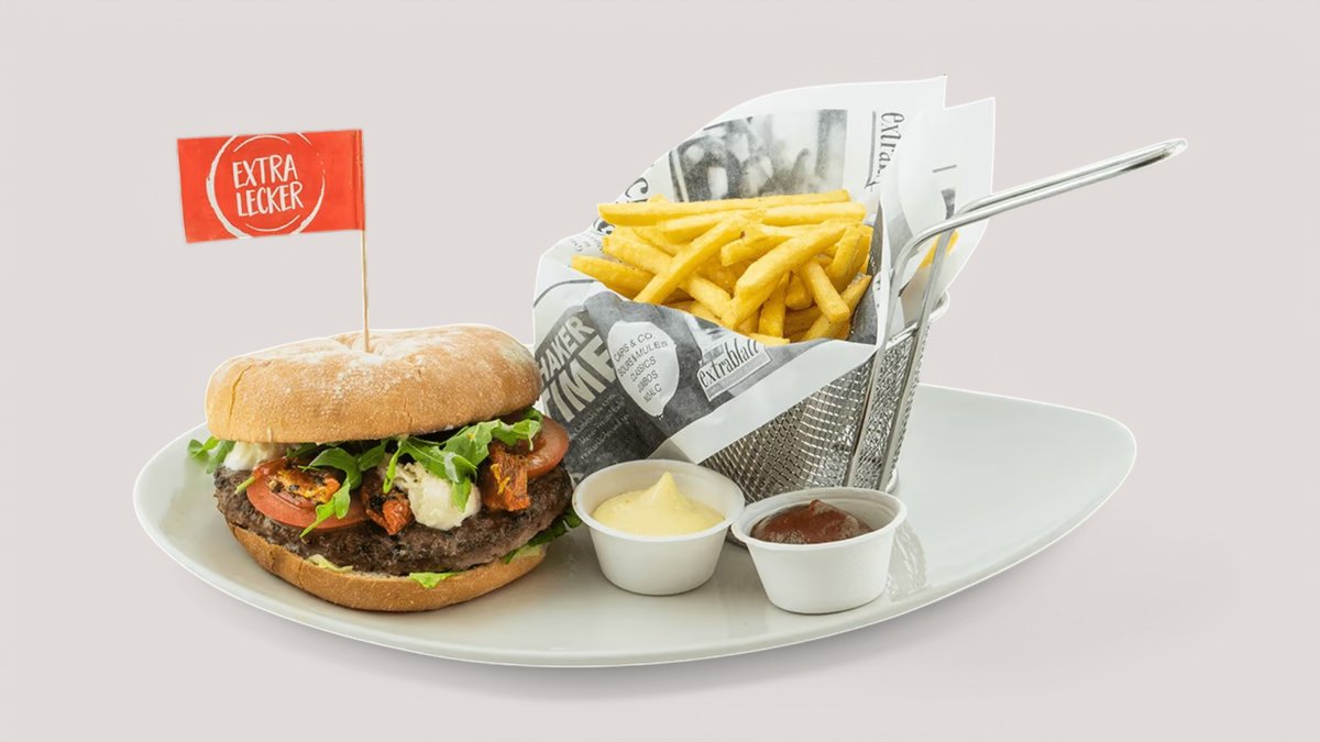 180 g saftig gebratenes Rinderhackfleisch mit Caesar-Dressing, Tomaten, Rucola, Mozzarella, halbgetrockneten Tomaten und CocktailsoĂźe