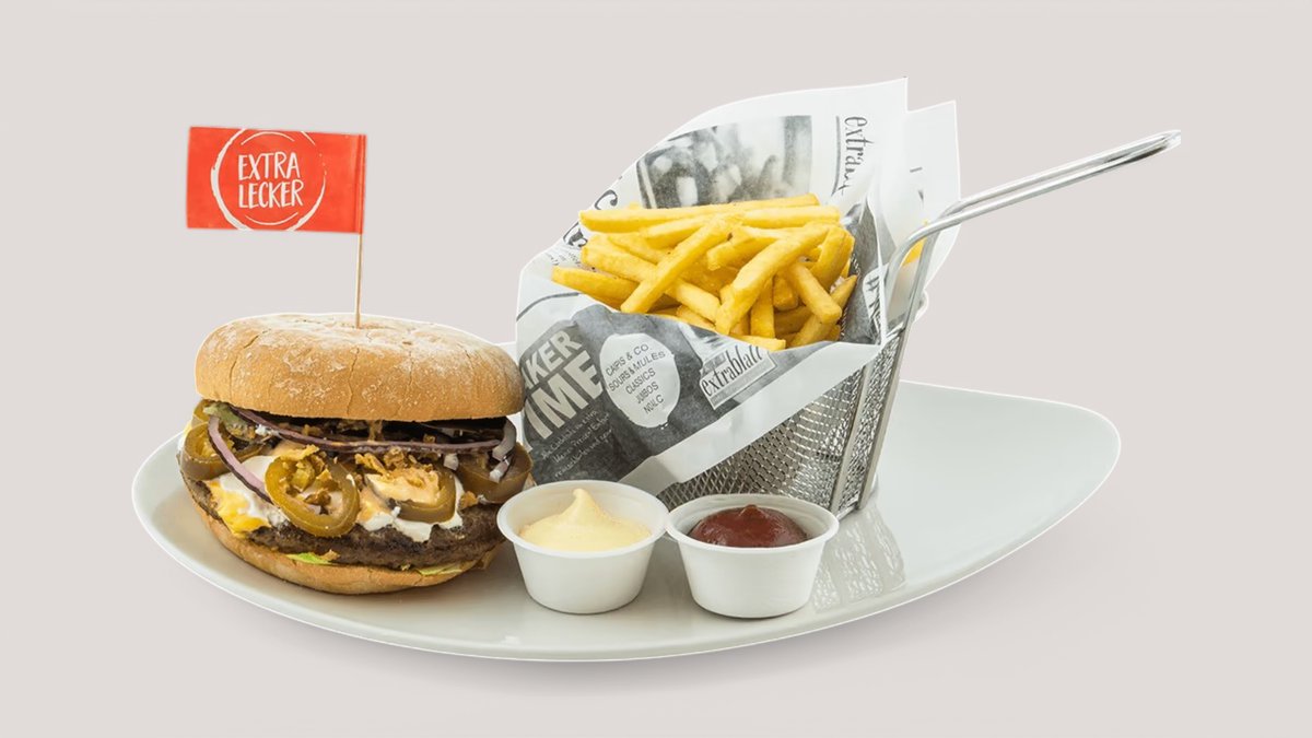 180 g saftig gebratenes Rinderhackfleisch mit hausgemachter Burgersoße, Jalapeños, Chesterkäse, knusprigem Schweinespeck und einer pikanten Käsesoße