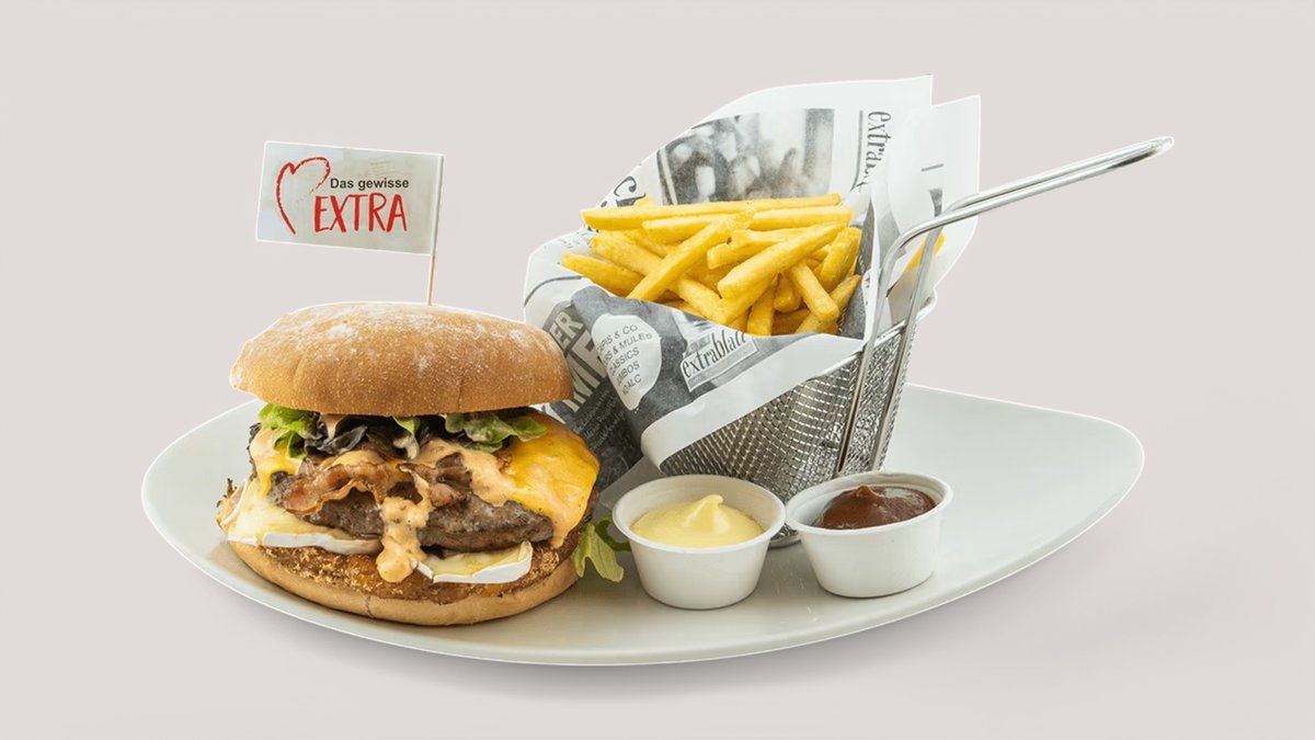 180 g saftig gebratenes Rinderhackfleisch mit hausgemachter Burgersoße, Chesterkäse, Brie, knusprigem Schweinespeck, knusprigen Kartoffelrösti und Cocktailsoße