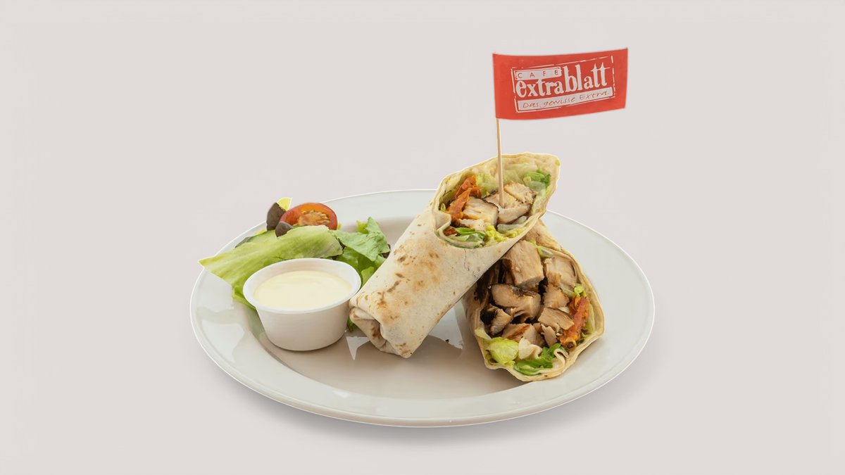 mit knusprigem Hähnchenfleisch, Barbecuesoße, Salat, roten Zwiebeln, marinierten Tomatenwürfeln und einem Dip deiner Wahl