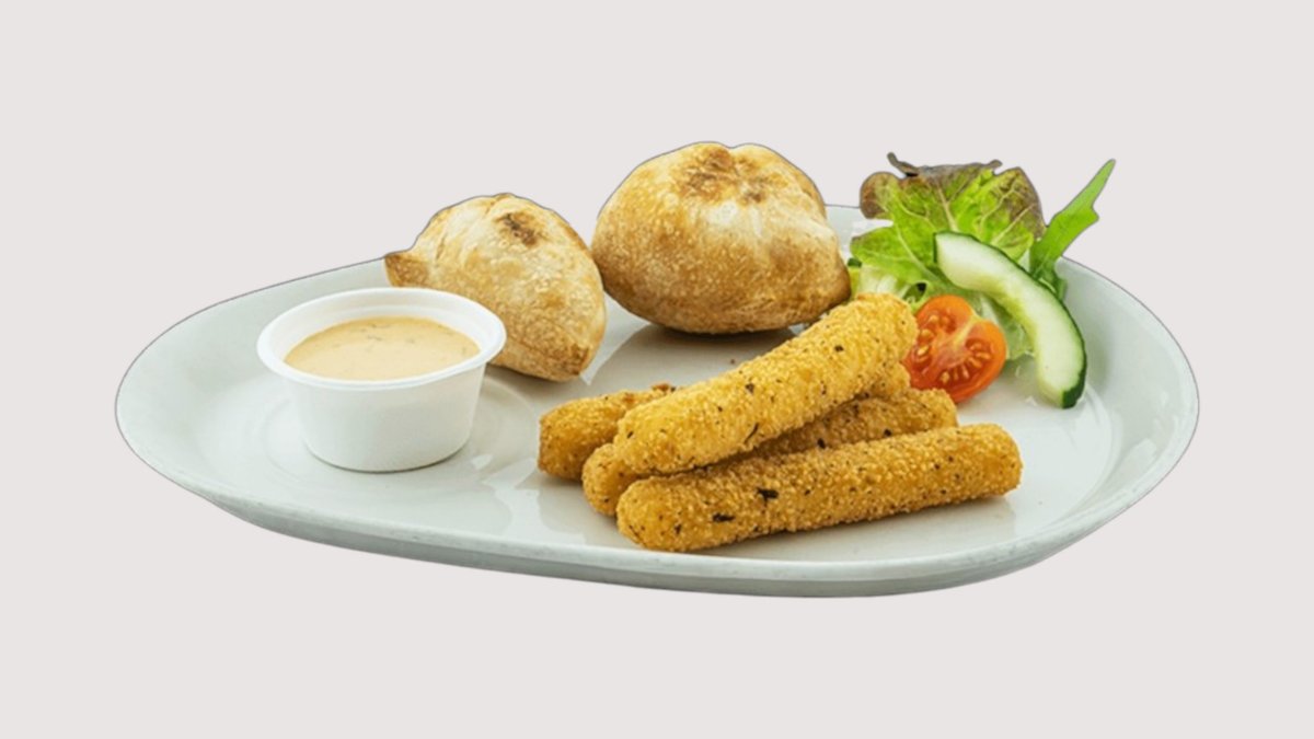 4 Stück im Kräutermantel mit einem Dip deiner Wahl und zwei Pizzabrötchen
