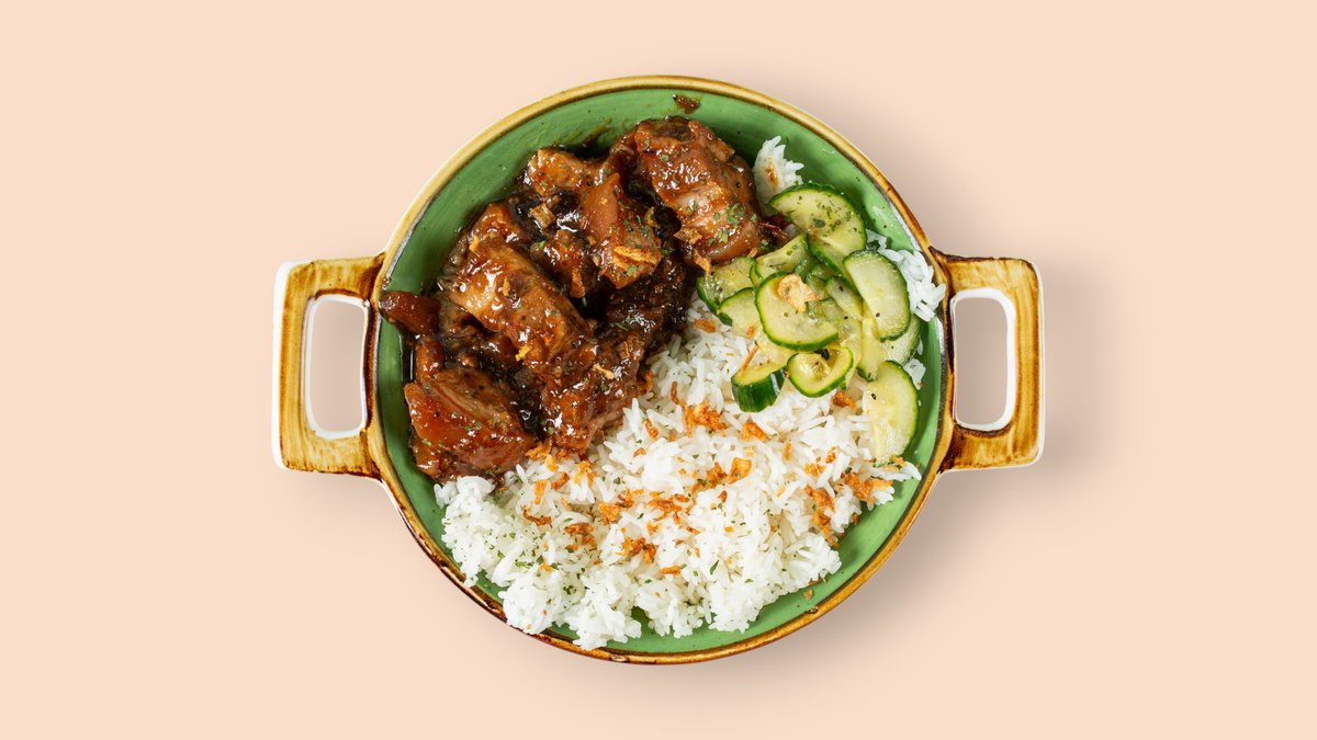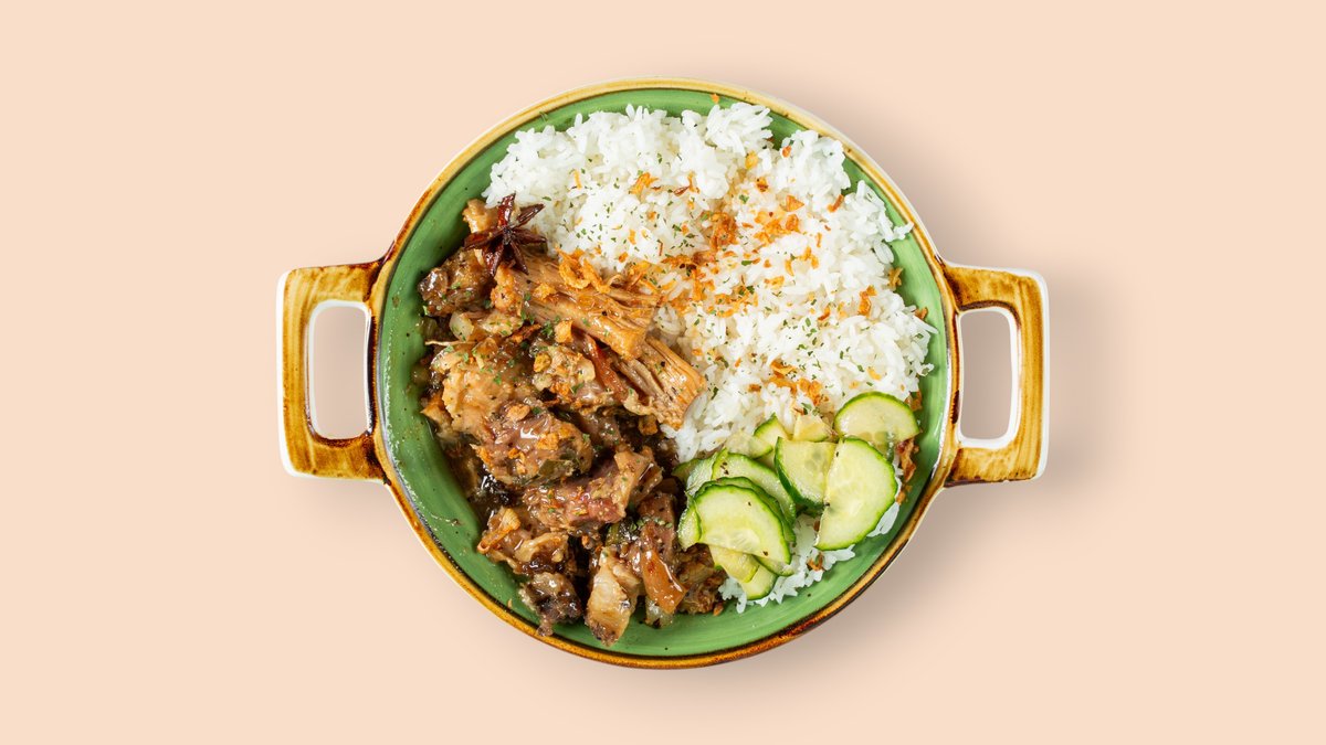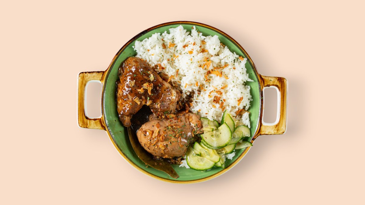 mit geschmortem Hähnchen in Essig, Sojasoße, Knoblauch und Pfeffer