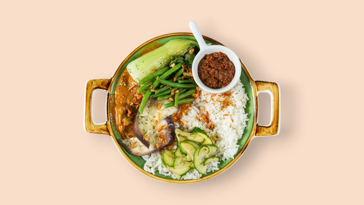 Eintopf mit Erdnusssoße, Auberginen, Bohnen, Bok Choy und fermentierten Garnelen