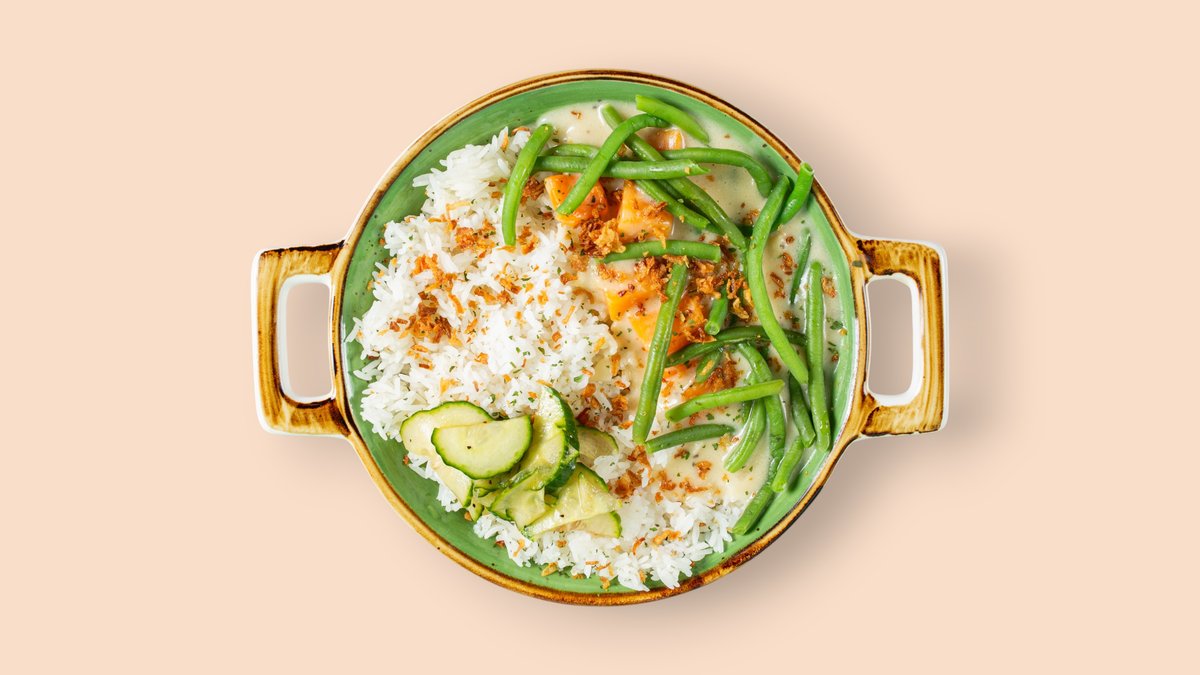 veganer Kürbiseintopf mit Kokosmilch, Gewürzen und veganem Fleisch
