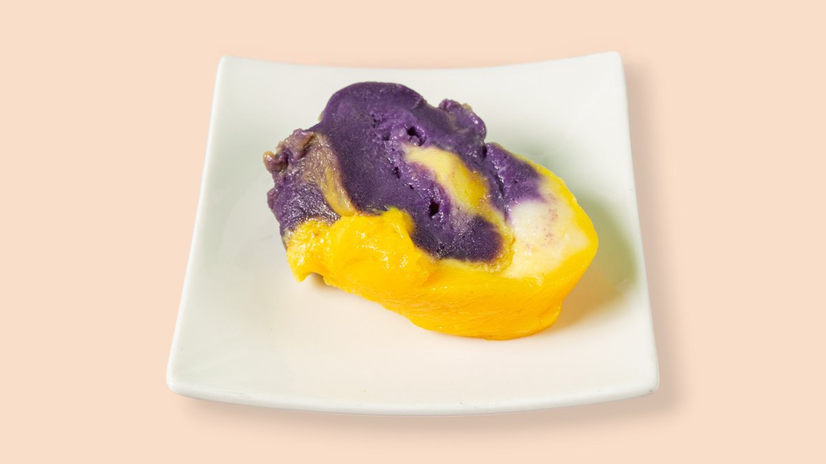 Schichtdessert mit Ube-Aroma, Kokosmilch, Klebreis und Zucker