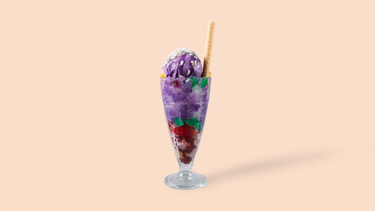 kalter Nachtisch mit Eis, Ube-Marmelade, Kondensmilch, Früchten, gesüßten Kidneybohnen, gelierten Kokosnussstreifen, Sago, Gulaman, Leche Flan und Eiscreme