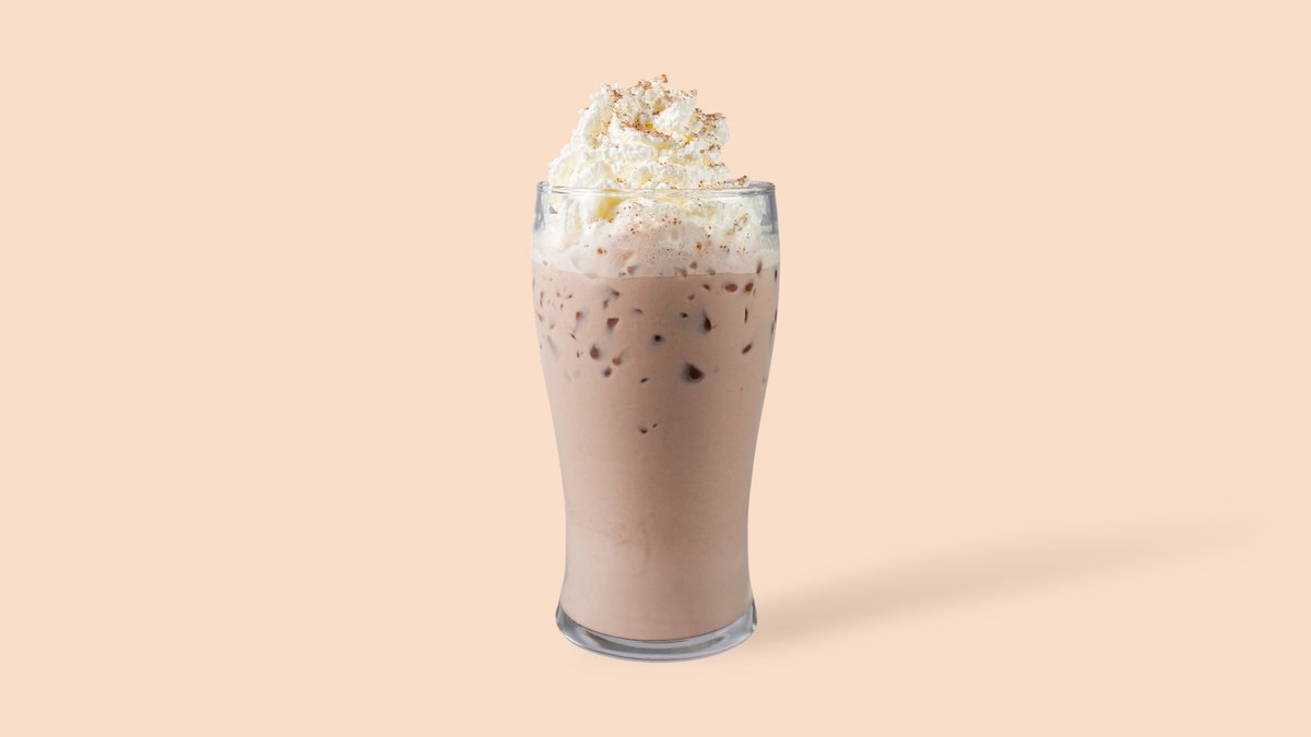 Ein gekühlter Cappuccino mit Eis serviert.
