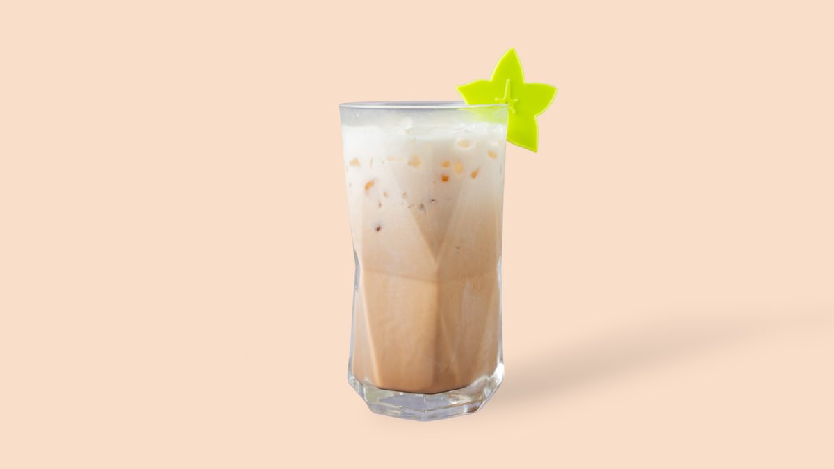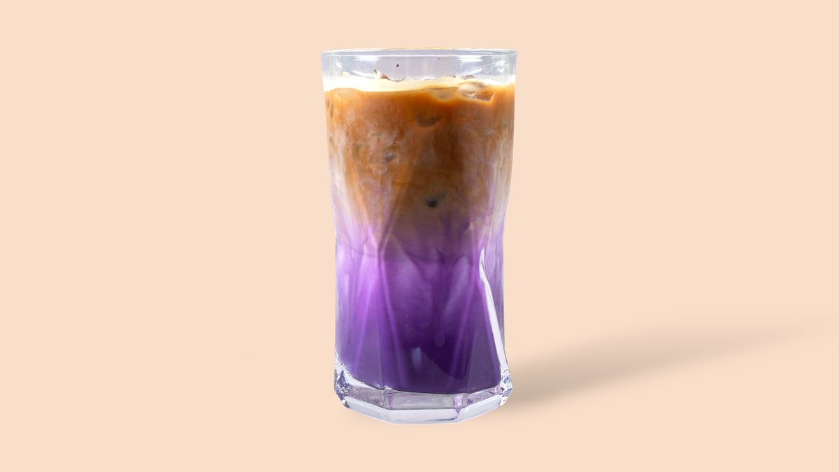 Kaltes Kaffeegetränk mit Ube. Koffeinhaltig, mit Süßungsmitteln und Farbstoffen, enthält Milch.
