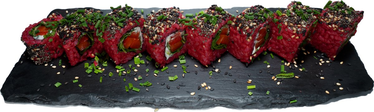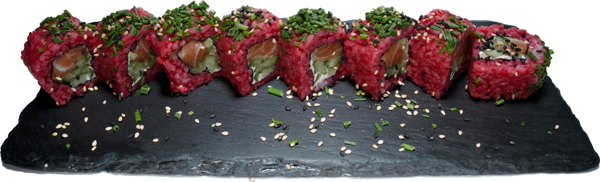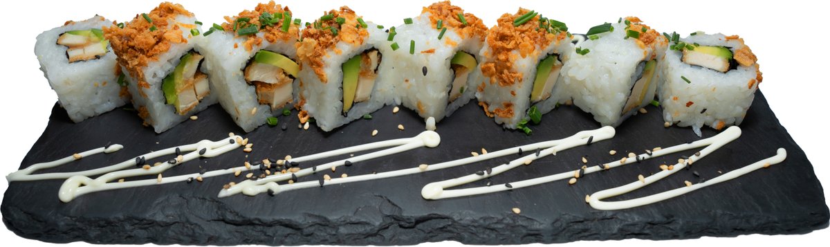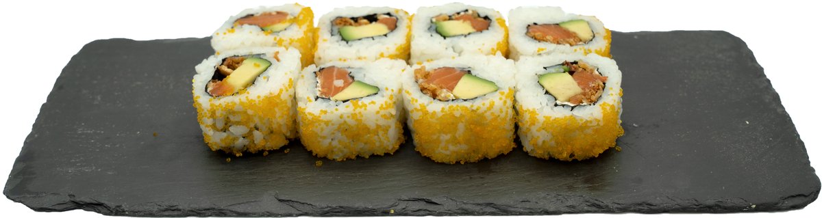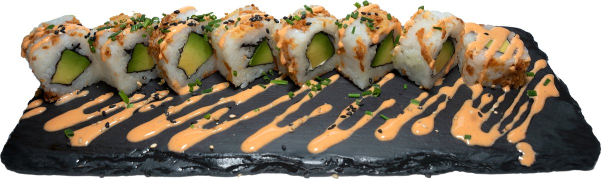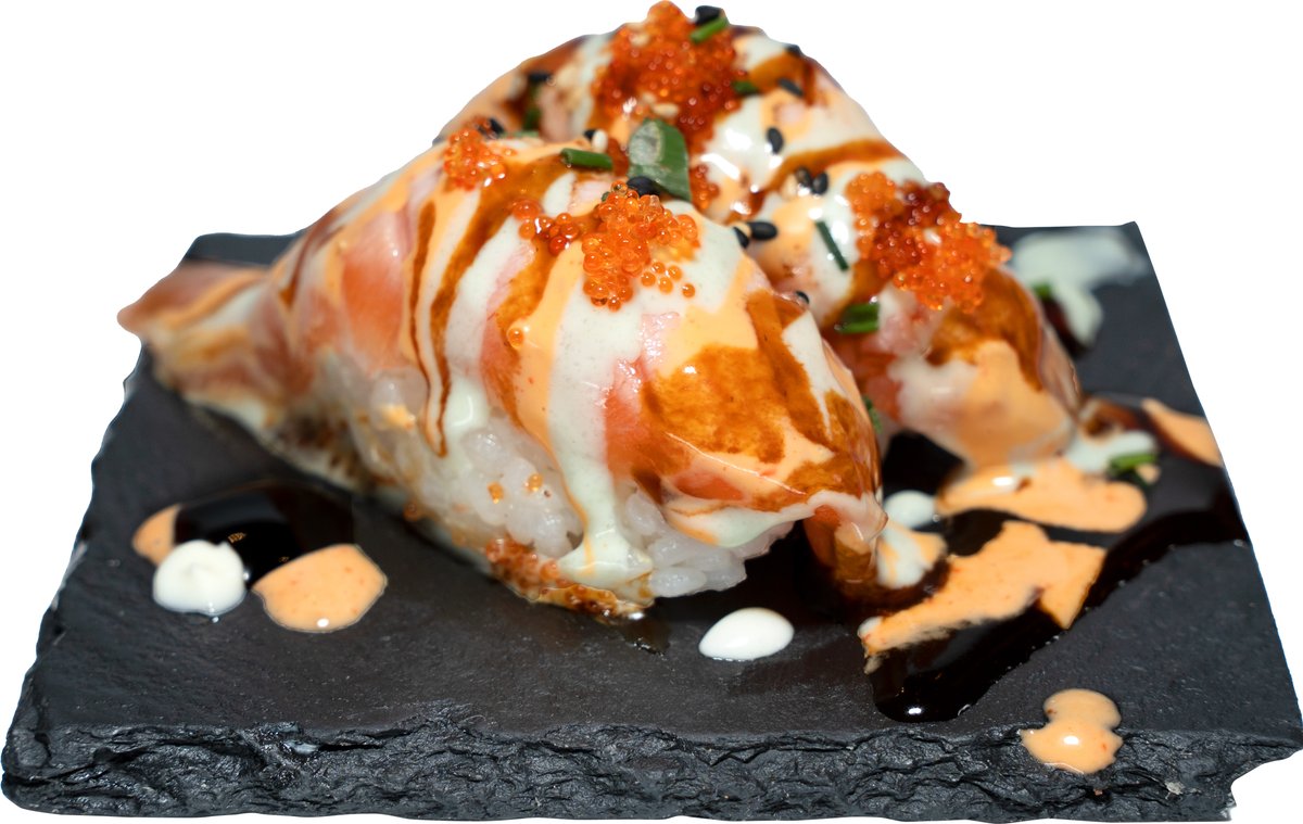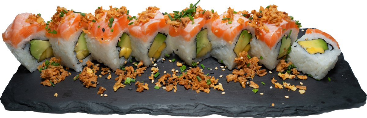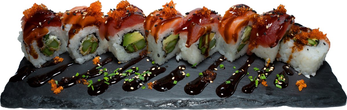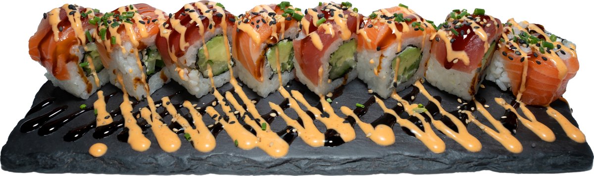 8 Stück gefüllt mit Frischkäse, Gurken und Avocado, umhüllt von flambiertem Lachs und Fischrogen, mit hausgemachter Spicy-Mayonnaise, hausgemachter Teriyakisoße und Wasabi-Mayonnaise