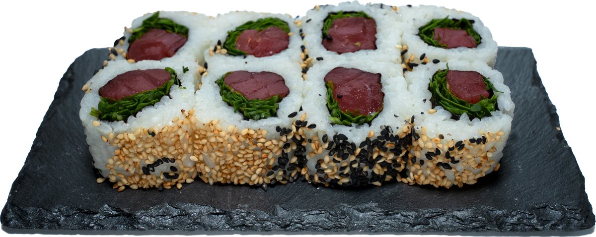 8 Stück gefüllt mit Frischkäse, Tempura-Garnelen und Avocado, umhüllt von weißem und schwarzem Sesam