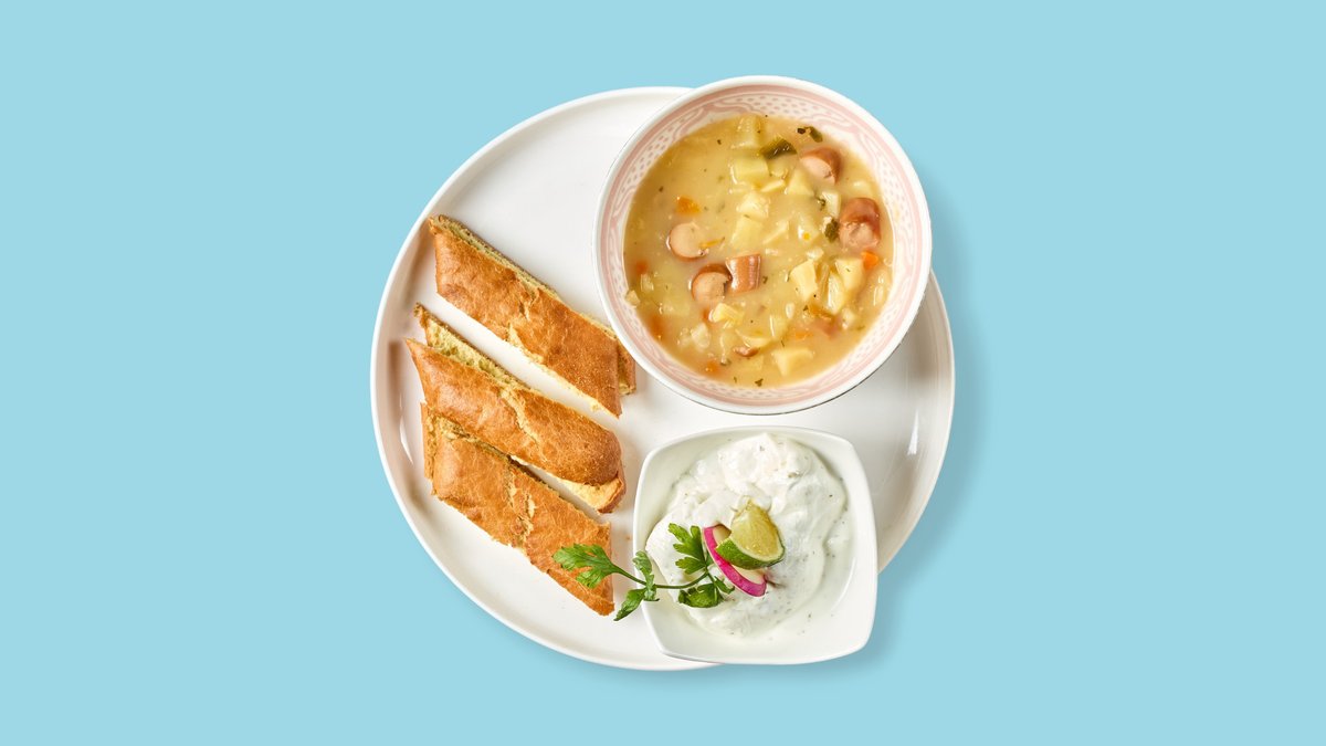 mild-pikanter Eintopf mit Kartoffeln, Paprika, Zwiebeln, Brot und Würtschen vom Rind