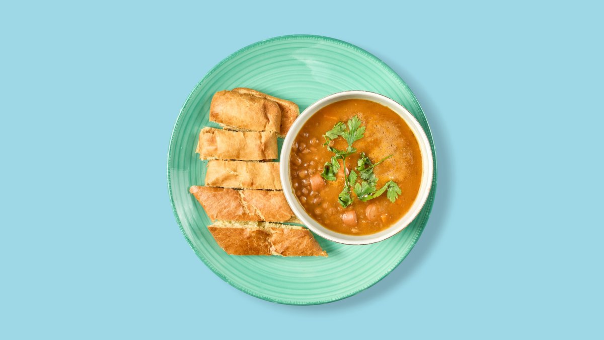 Eintopf mit Tellerlinsen, Kartoffeln, Gemüse, Brot und Würtschen vom Rind
