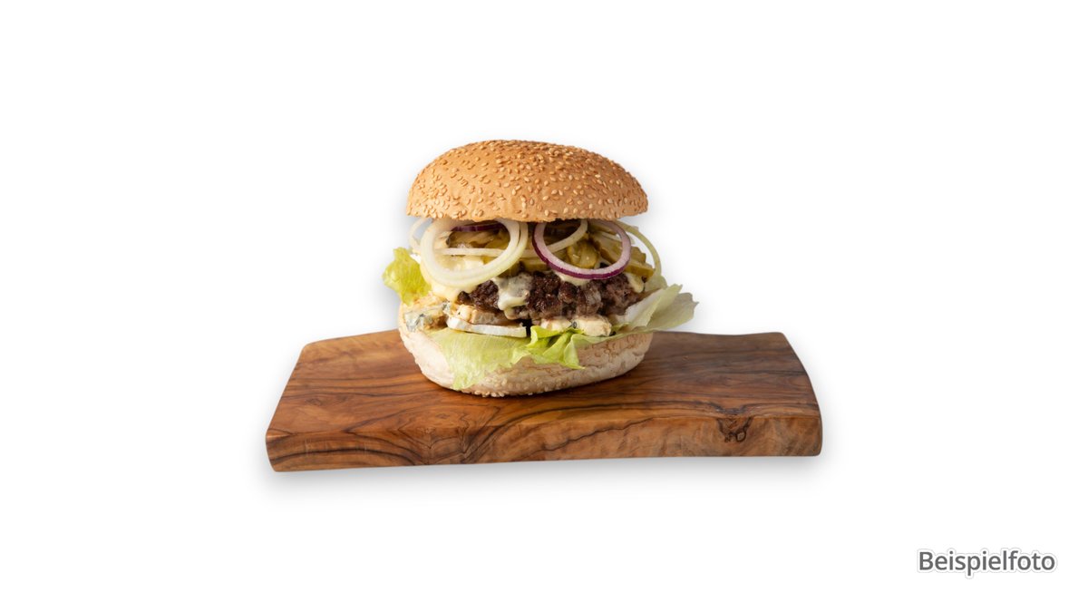 alle Burger werden mit Salat, Tomaten und Gewürzgurken zubereitet („Vegge-Burger“ wird ohne Tomaten zubereitet)