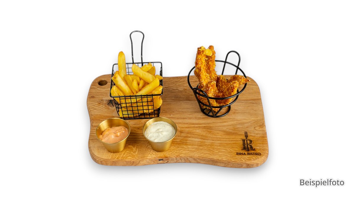 4 Mozzarella-Sticks, 4 Brokkoli-Nuggets und 4 Chicken-Nuggets, serviert mit Pommes, inklusive 2 Saucen nach Wahl.