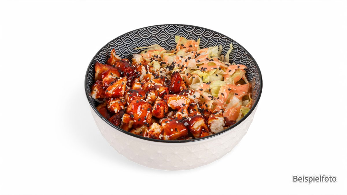 mit Basmatireis, Hähnchen Teriyaki, Avocado, Gurken, Karotten, Kirschtomaten und Sesam