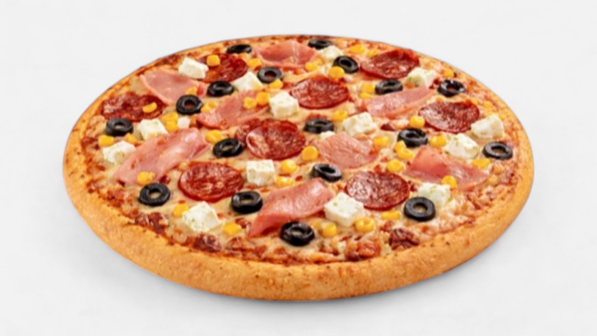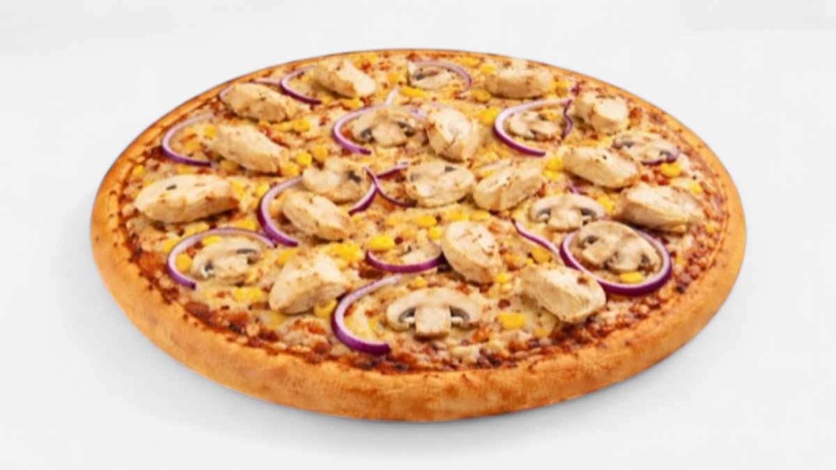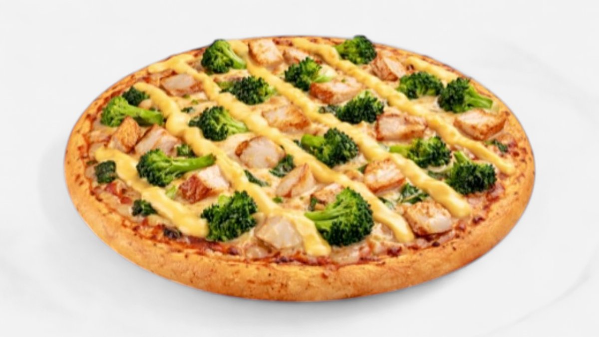 mit Hähnchen, Brokkoli, Mais, milden Peperoni und Gouda