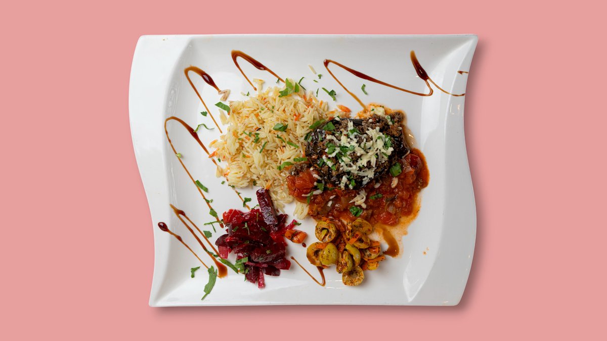 mit Hackfleisch vom Rind und Lamm, Käse überbacken, zwei Vorspeisen und Mandi-Reis