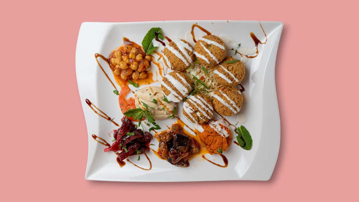 verschiedene Vorspeisen mit zwei Falafeln und frittiertem Käse in einer Größe deiner Wahl