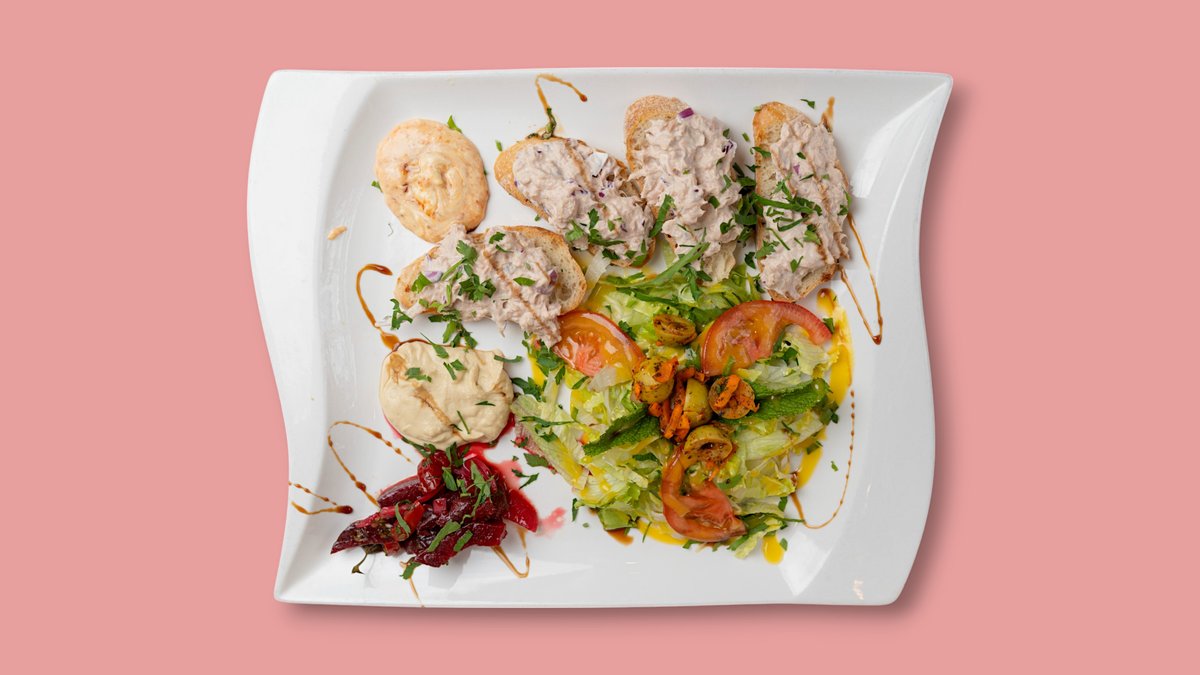 6 Stück mit fünf verschiedenen Vorspeisen und arabischem Fladenbrot in einer Größe deiner Wahl
