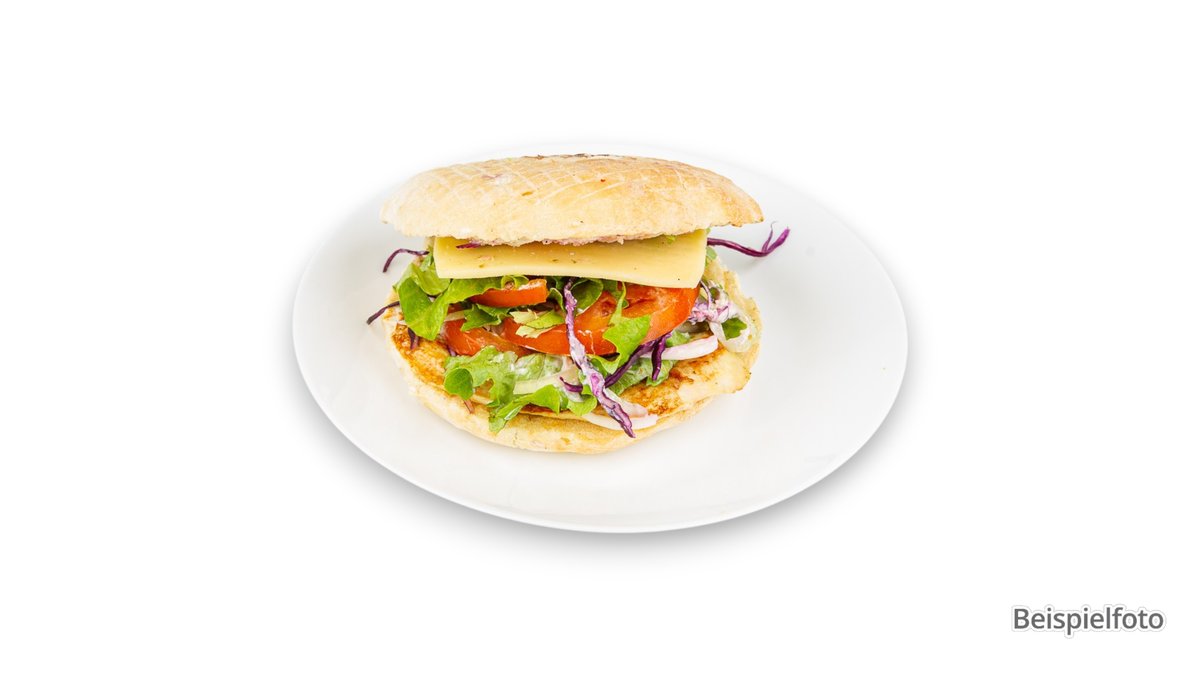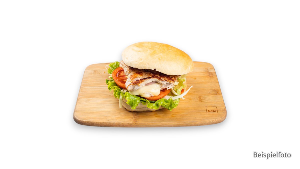 knuspriges Hähnchenfilet, Eisbergsalat, Tomatenscheiben, Burgerkäse und Barbecuesoße