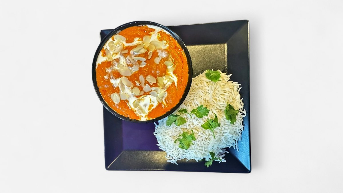 Zartes Hähnchen in würzigem Joghurt mariniert, geschmort in cremiger Tomaten-Butter-Sauce inkl. Reis