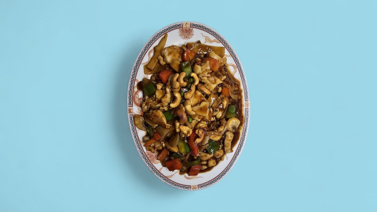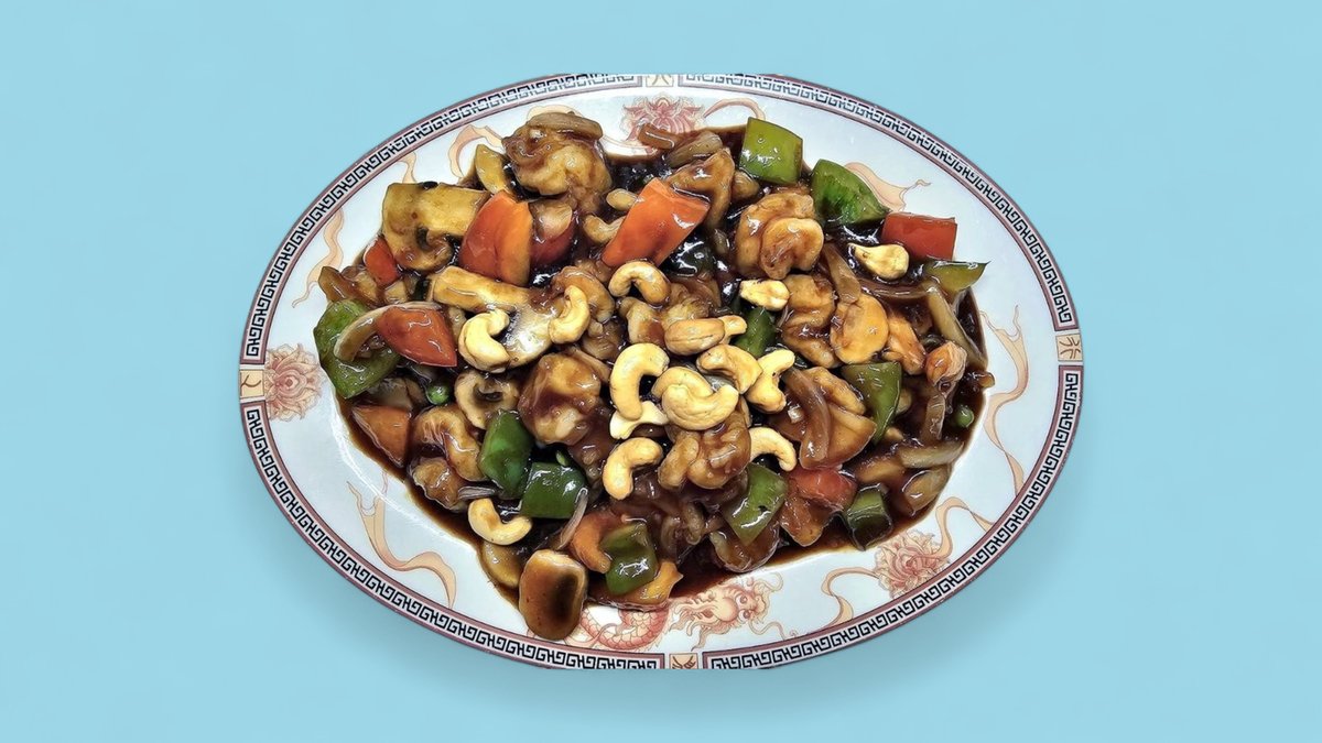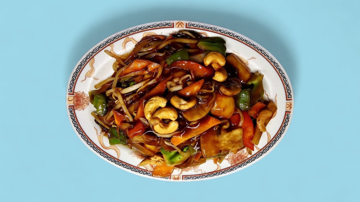 mit Cashewnüssen, Bambus, Champignons und Zwiebeln