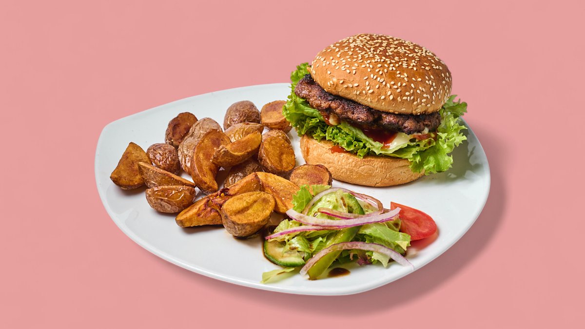 Rindfleischpatty mit Käse, Pommes und Ketchup