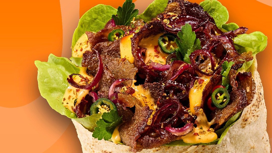 Rindersteak, Käse, Mexican-Sauce, Blattsalat, Weißkraut, Tomate und rote Zwiebel