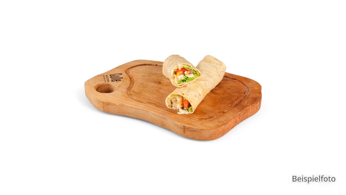 mit Zwiebeln, Käse, Tomaten, Eisbergsalat, Curry-Hummus-Soße und einer Fleischsorte deiner Wahl