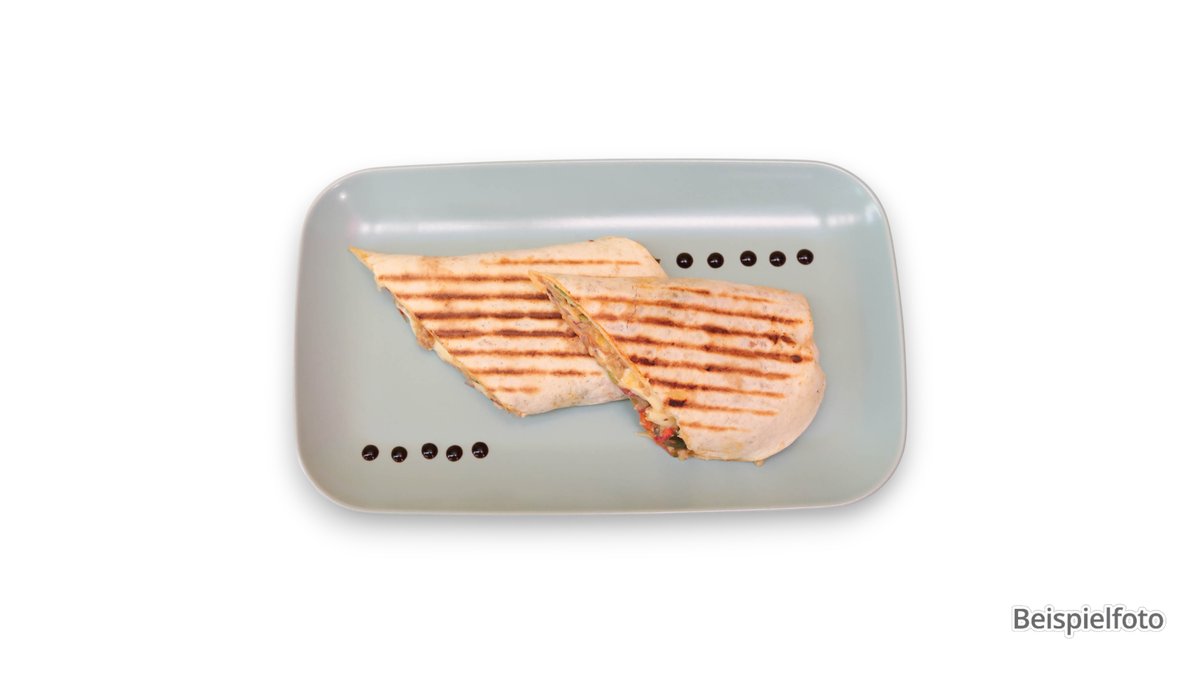 mit Putenfleisch, Eisbergsalat, Tomaten, gebratenen Zwiebeln, Paprika, Tikka-Soße und Tsatsiki