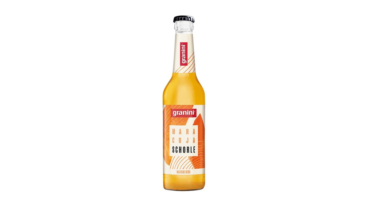 Maracujaschorle, Mischung aus Maracujasaft und Mineralwasser, ohne Zuckerzusatz, mit Kohlensäure