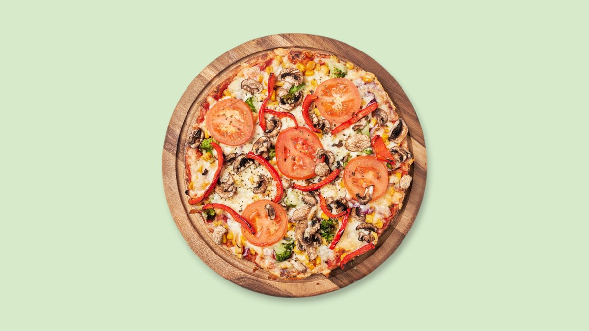 mit roten Zwiebeln, Mais, Brokkoli, Champignons, Tomaten und Paprika