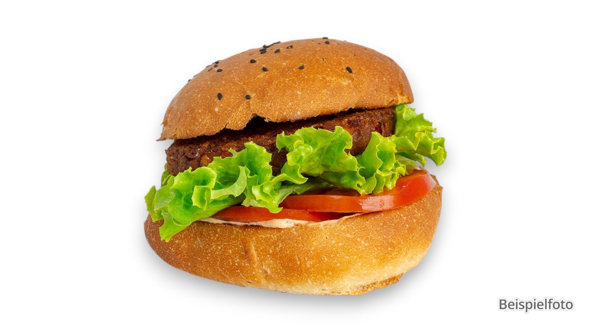 mit Beyond Meat, Ketchup, Salat, Cheddar, sauren Gurken, roten Zwiebeln, Tomaten und simpleburger© Soße