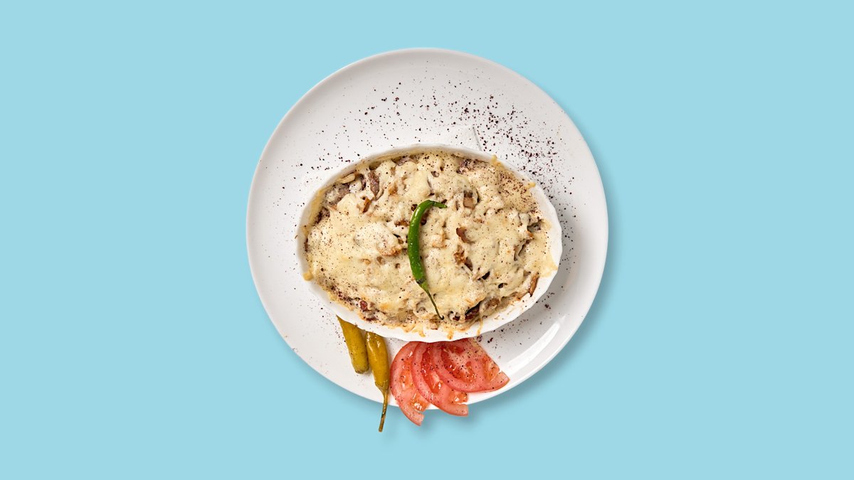 mit einer Fleischsorte deiner Wahl und mit Käse überbacken